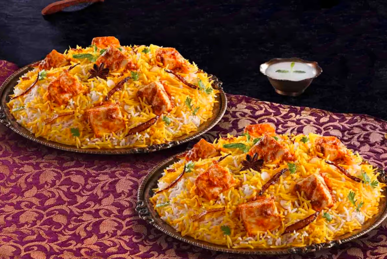 (Served with 1 Gulab Jamun & Mint Raita) In this extravagant dish, soft & crumbly, fresh paneer is marinated with exquisite royal spices & layered with basmati to create a dish that is as delectable as it is extravagant